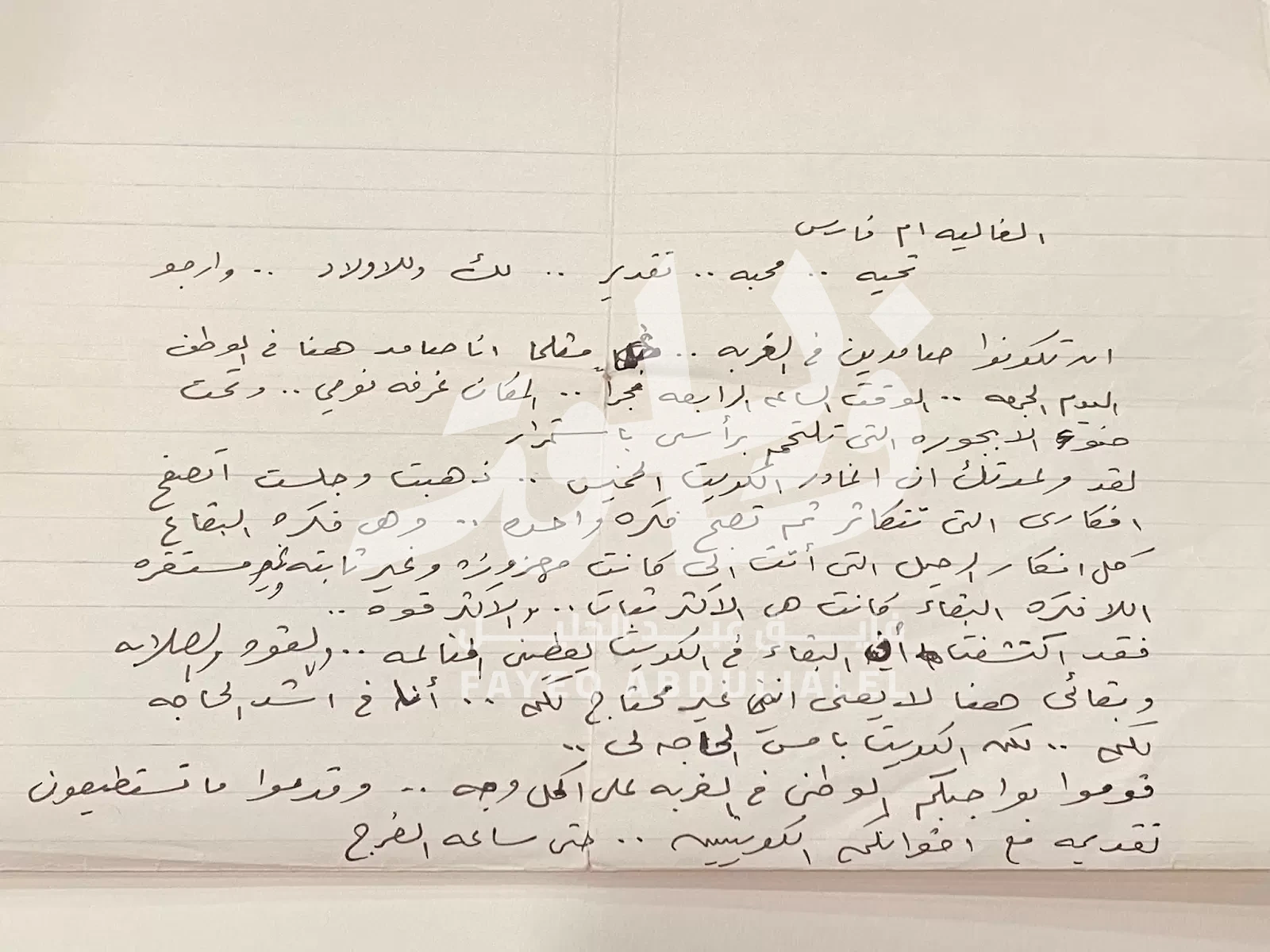 نص الرسالة الغالية أم فارس تحية .. محبة .. تقدير .. لك و للأولاد .. و أرجو أن تكونوا صامدين في الغربة.. مثلما أنا صامد في الوطن. اليوم الجمعة .. الوقت الساعة الرابعة فجراً .. المكان غرفة نومي .. و تحت ضوء الأبجورة التي تلتحم برأسي باستمرار. لقد وعدتك أن أغادر الكويت الخميس .. ذهبت وجلست أتصفح أفكاري التي تتكاثر ثم تصبح فكرة واحدة .. و هي فكرة البقاء كل أفكار الرحيل التي أتت أليّ كانت مهزوزة و غير ثابتة و غير مستقرة الا فكرة البقاء كانت هي الأكثر ثبات .. و الأكثر قوة.. فقد اكتشفت أن البقاء في الكويت يعطيني المناعة .. والقوة والصلابة وبقائي لا يعني أنني غير محتاج لكم .. أنا في أشد الحاجة لكم .. لكن الكويت بأمَـسّ الحاجة لي .. قوموا بواجبكم الوطني في الغربة على أكمل وجه .. وقدموا ما تستطيعون تقديمه مع إخوانكم الكويتيين .. حتى ساعة الفرج.